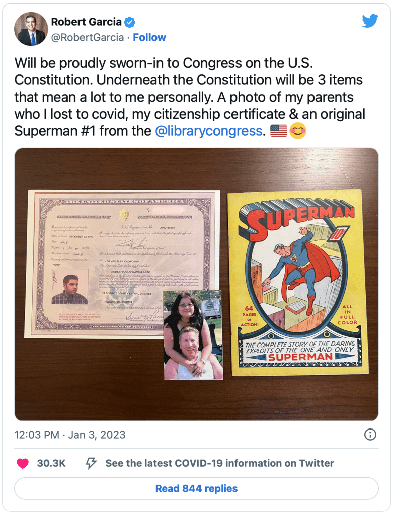 Glen Weldon wrote a wonderful article for NPR (see full article here) discussing this and talking through why Rep. Garcia would choose to use a Superman #1 to be sworn into office with. In the article he breaks down what this particular issue of Superman means and defines. It really is a wonderful article. However, there are a quote I would like to pull and highlight here.